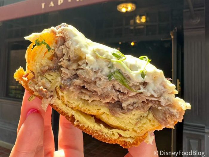 The bread puff lived up to its name by being light and fluffy. The beef filling reminded me of a Philly cheese steak with the thinly sliced meat and the cheese sauce over top — it had a great fondue-like cheese pull.