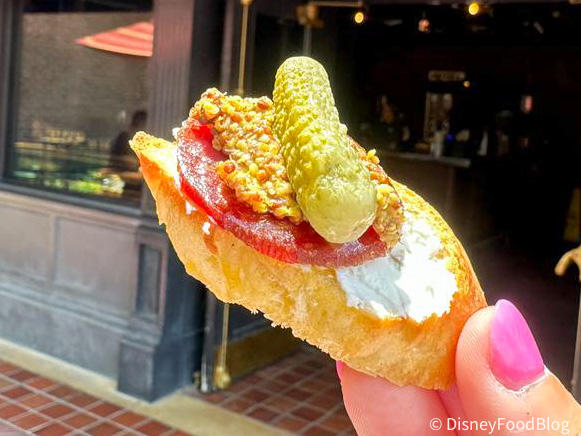 The goat cheese really had a nice creamy taste. The cornichons and extra garnishes added extra textures to the bites we created. The baguette slices were everything you want in a baguette –a buttery and texture that was crispy on the edges and soft on the inside as you g0t further into the bite.