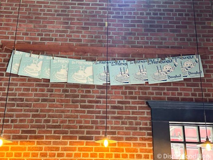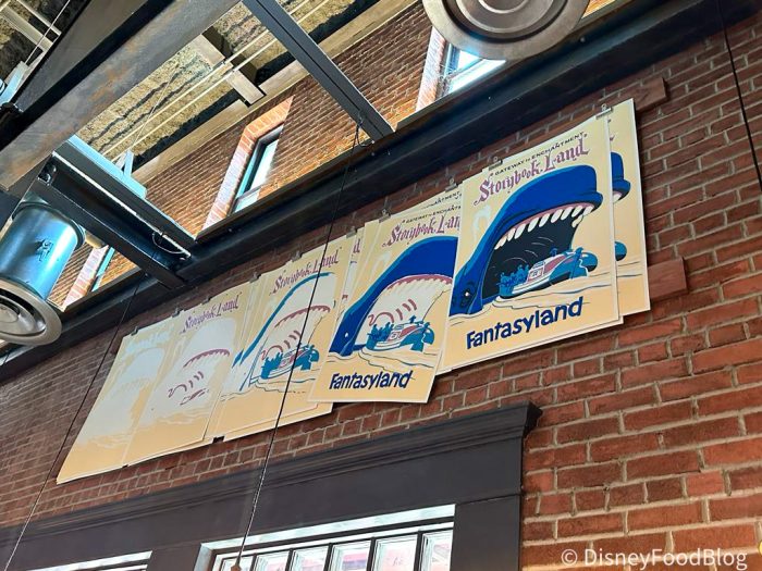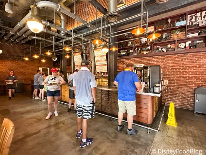 The vibe here is relaxed and easy-going. The walls are brick and covered in callbacks to Disney history and an homage to what was previously in this spot. This wall has letters placed around it that spell out “Writer’s Stop” — our beloved spot for coffee and pastries, which was the original home of the Carrot Cake Cookie.