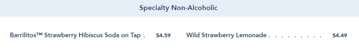 We also spotted one soda option in the Barrilitos Strawberry Hibiscus Soda, and an additional non-alcoholic beverage — Wild Strawberry Lemonade.