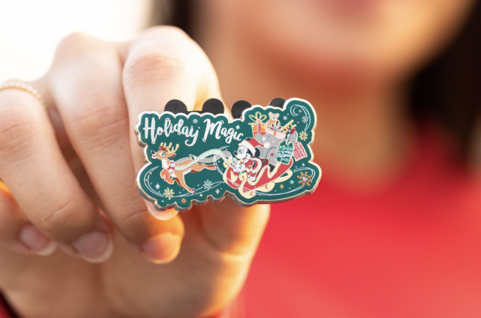 Up next, check out this pin! It says, “Holiday Magic.” If you collect pins, you might have to grab this one during your holiday party.