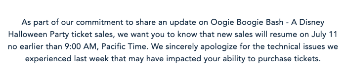 Disney has shared that Oogie Boogie Bash ticket sales will resume on July 11th no earlier than 9AM PT! After the initial chaos of ticket sales being paused due to technical issues, folks will be able to hop in the queue and try to snag a ticket once again — we just hope it’s a bit less chaotic this time around.