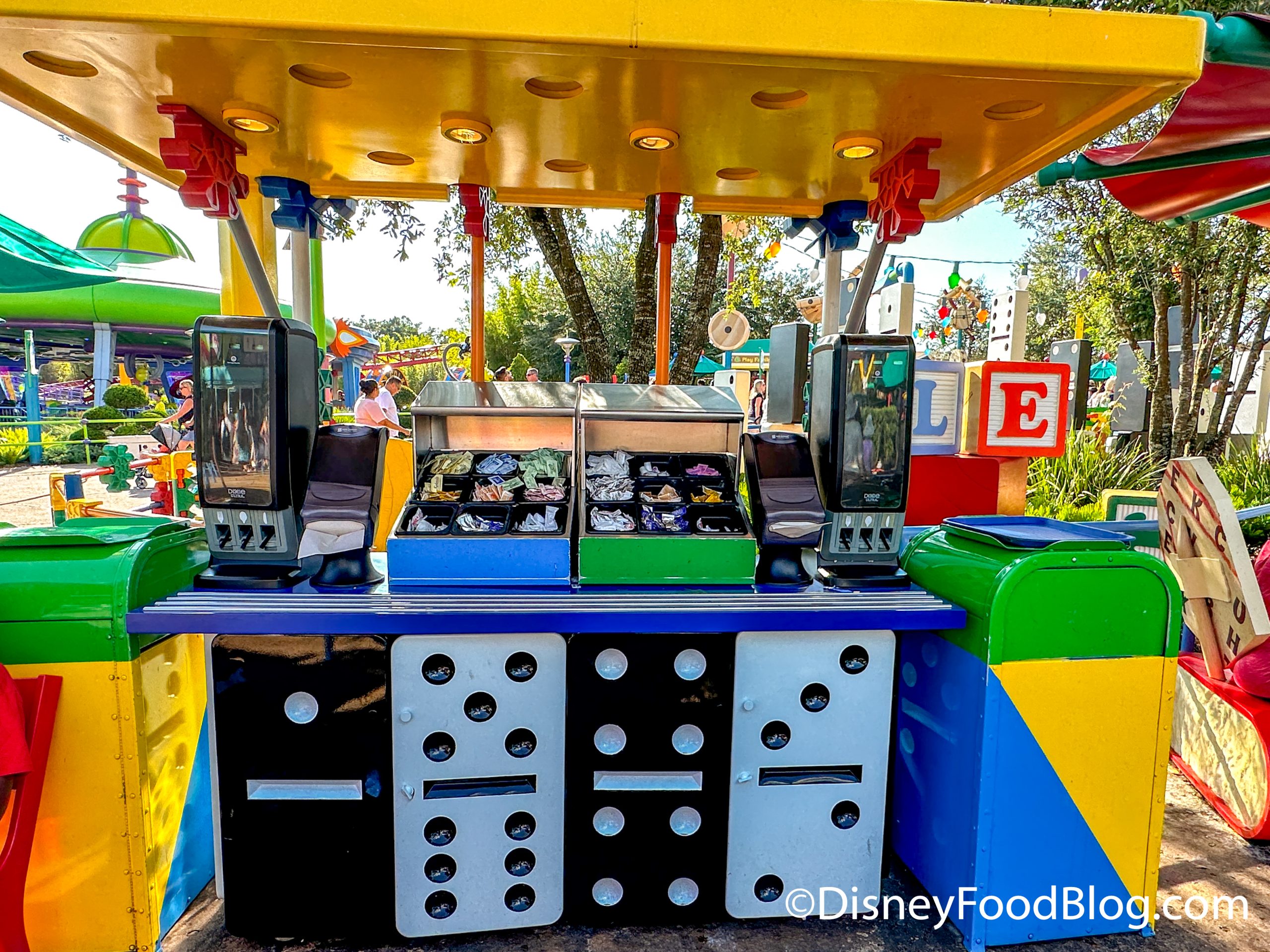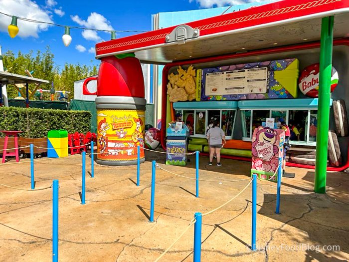 If you’re walking around Andy’s backyard, you probably won’t miss this whimsical spot near Alien’s Swirling Saucers. Just like everything else in Toy Story Land, it is full of huge, colorful details that make you feel toy-sized.