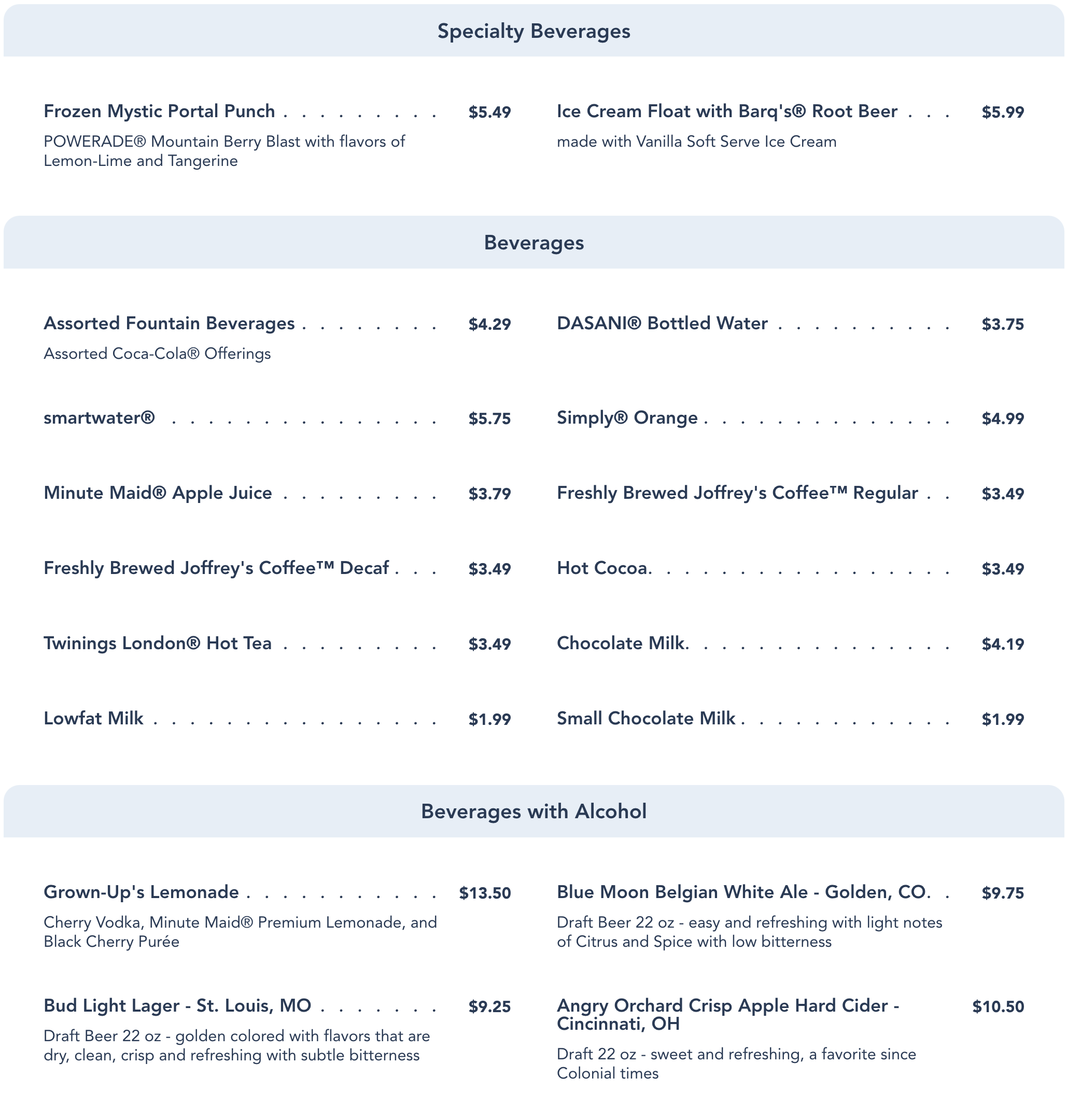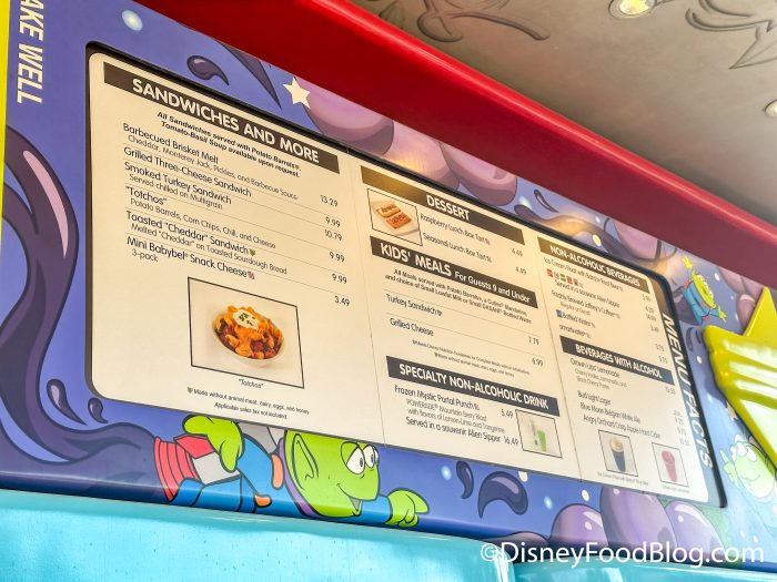 Lastly, there are quite a few beverages to choose from. Frozen Mystic Portal Punch and the Ice Cream Float with Barq’s Root Beer are specialty beverage options. There’s a long list of soft beverages, teas, juices, hot cocoa, and other drinks to choose from. If you’re looking for something with some alcohol, you can try the Grown-Up’s Lemonade or one of their beer options.