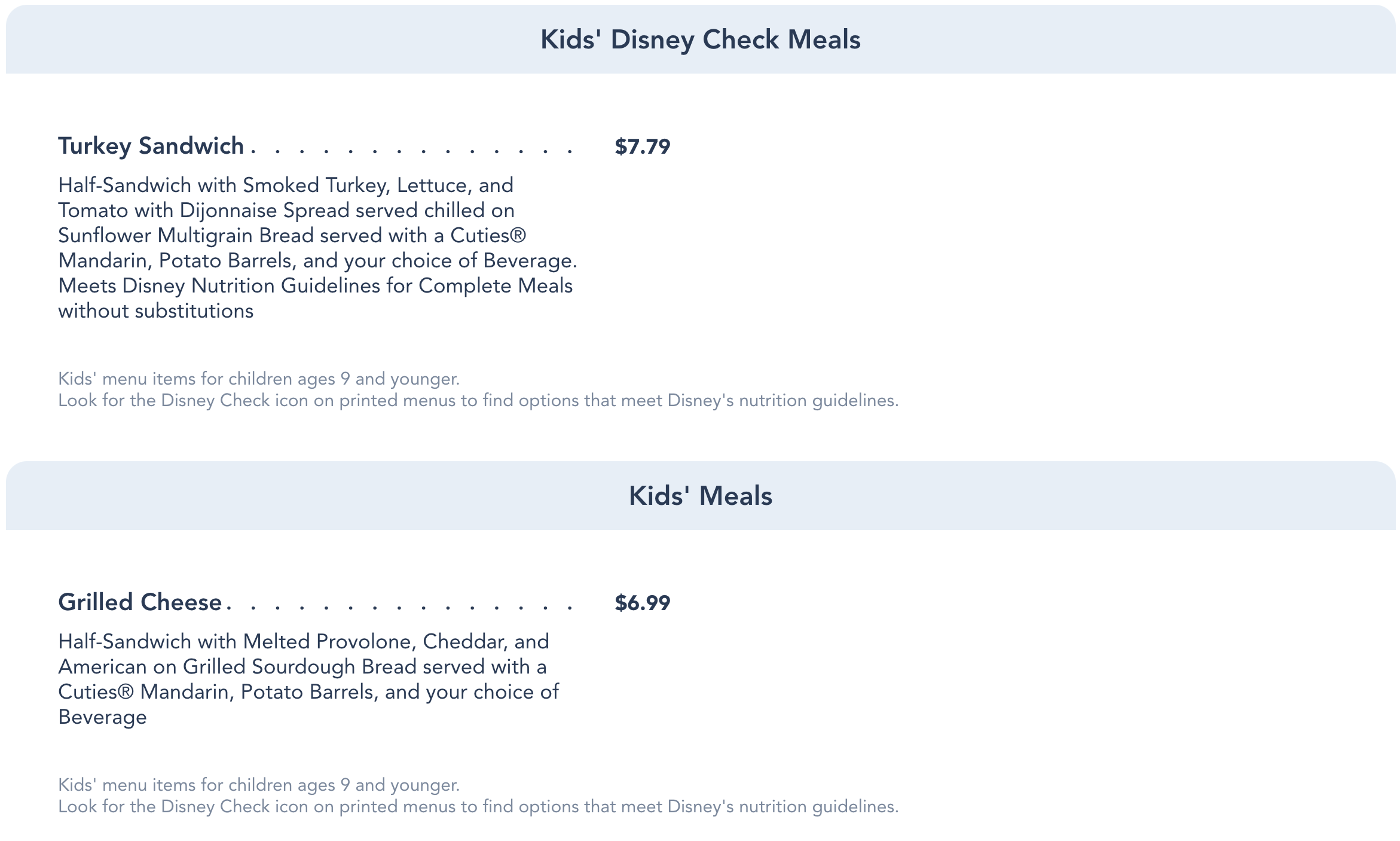 Kids can choose between the Turkey Sandwich or the Grilled Cheese.