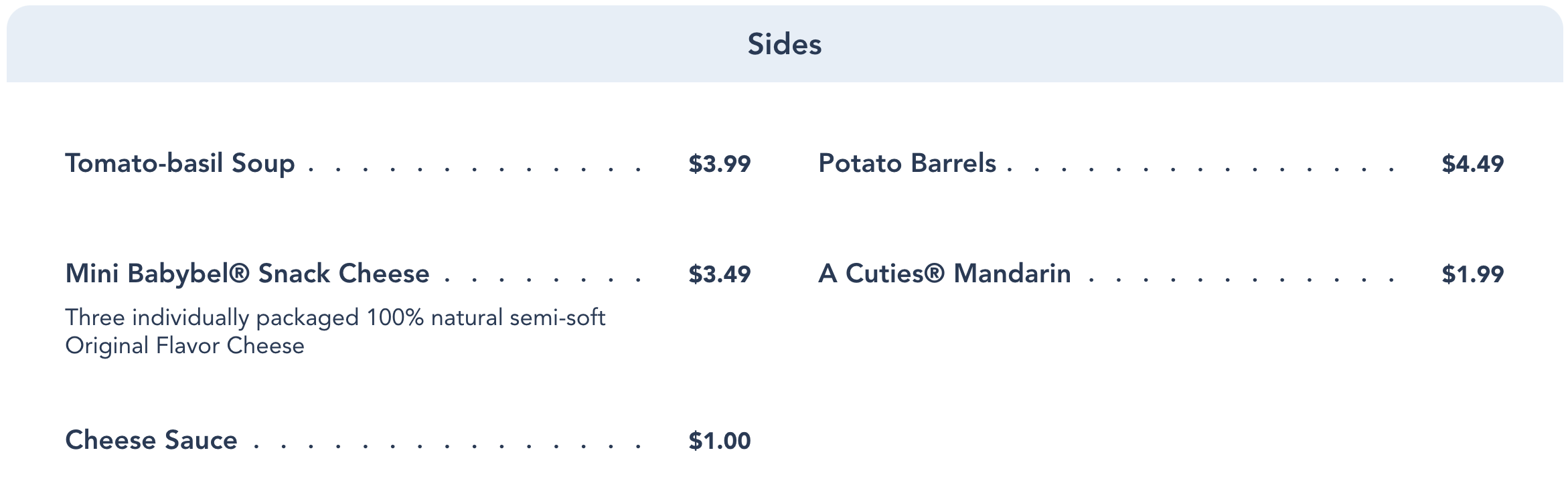 The sides menu includes items like Tomato-Basil Soup, Potato Barrels, and Mini Babybel Snack Cheese.