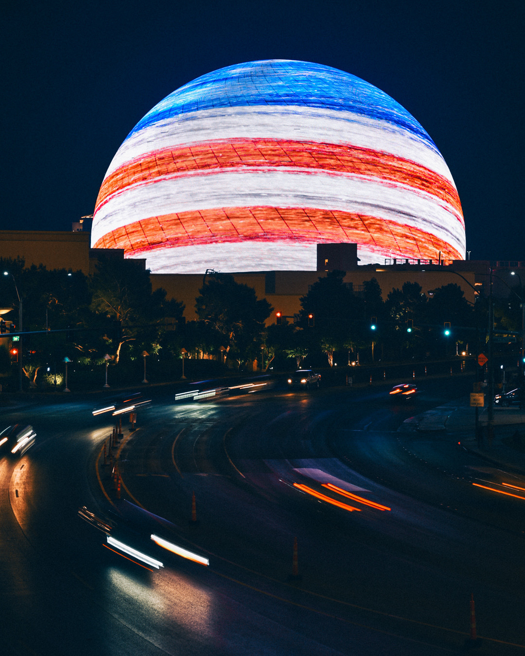 Las Vegas is now home to the MSG Sphere, the largest sphere in the world. Although it hasn’t technically made its big debut yet, the sphere showed off a little bit on the Fourth of July with a light display that included the American flag, a basketball, Earth, and more, according to the Sphere Twitter account.