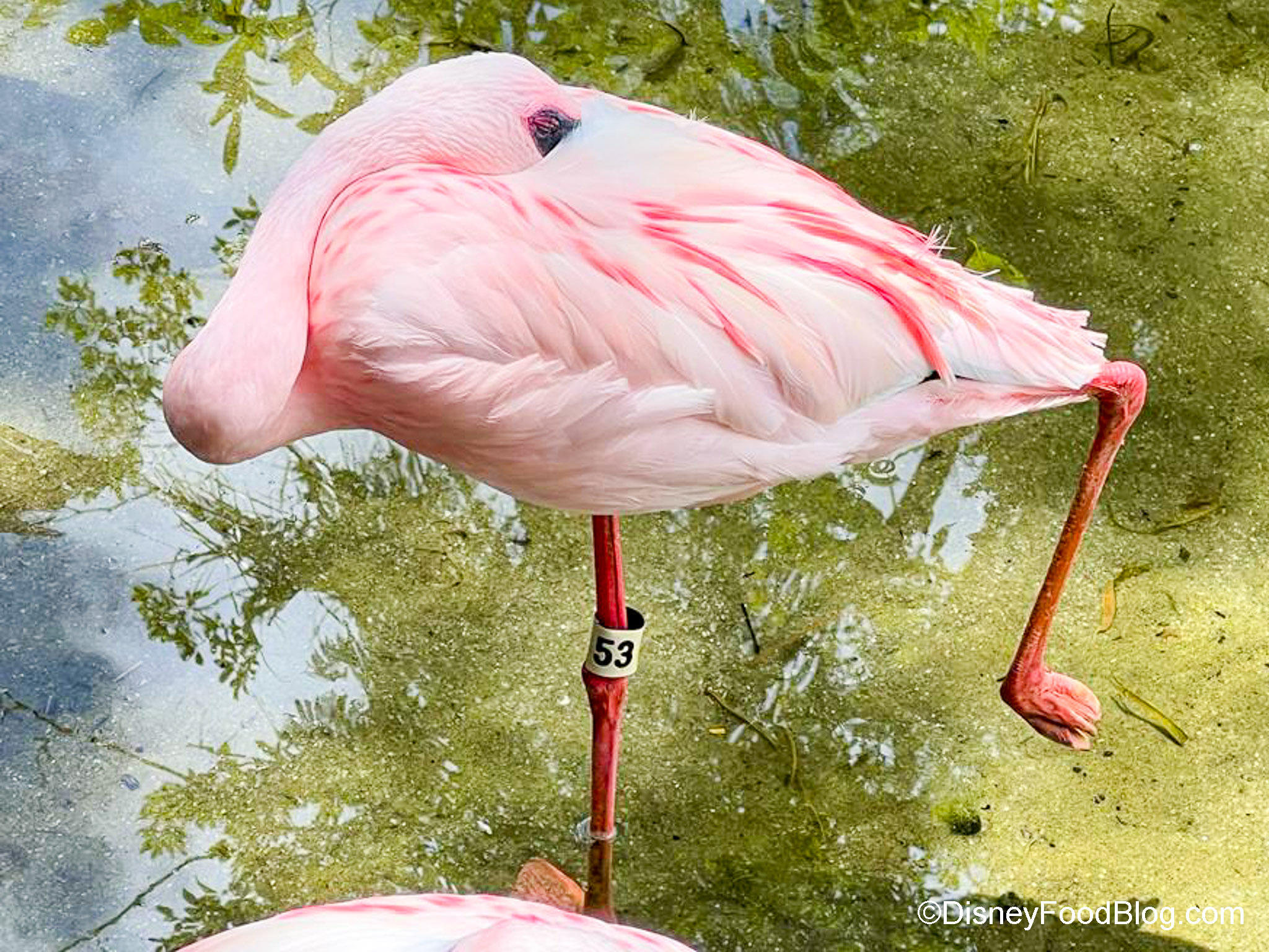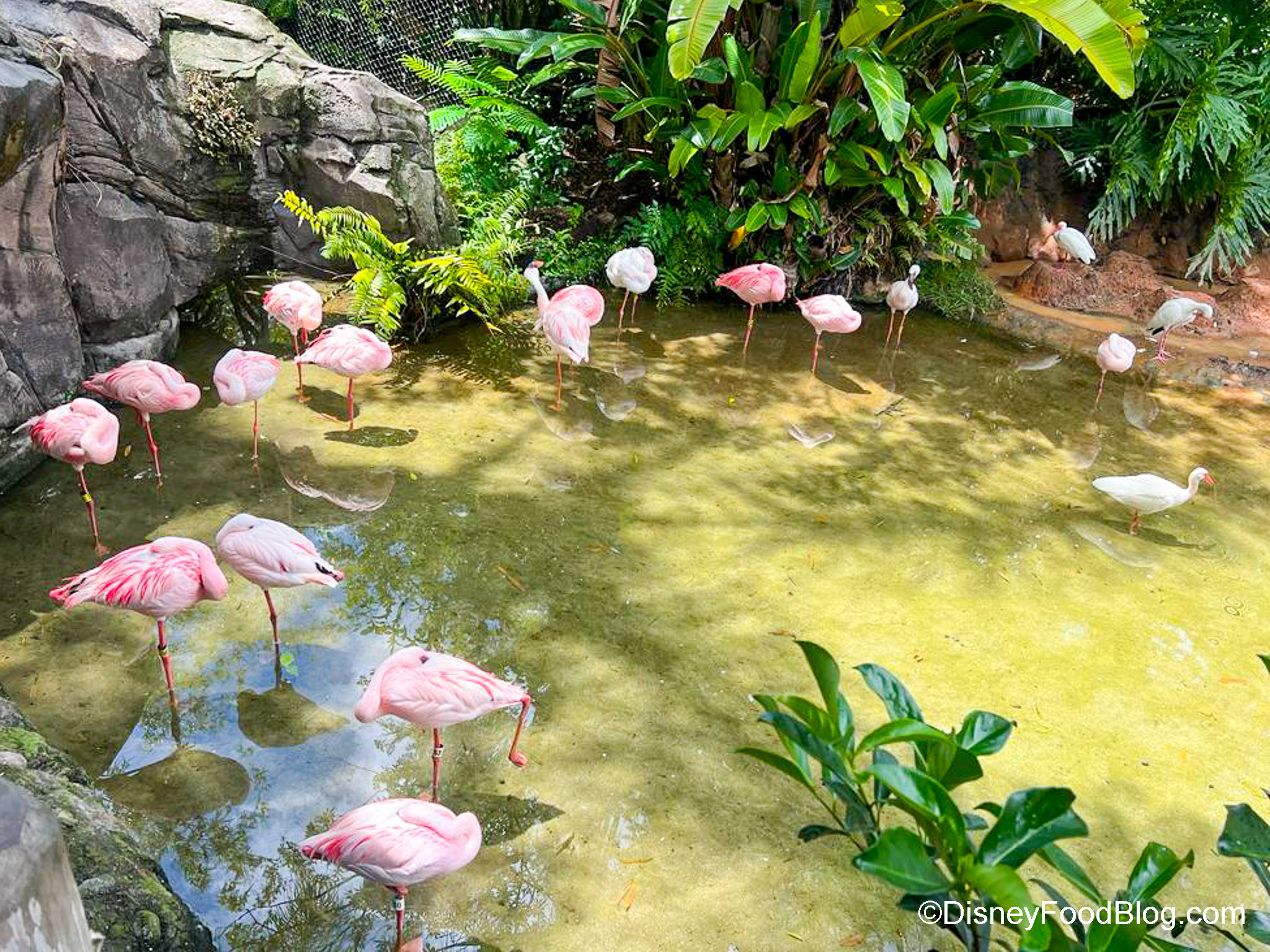 We also just learned from a Cast Member that these lesser flamingos are the smallest of ALL the flamingos. Also, flamingos don’t have eyelids, so that’s why they bury their face in their feathers when they sleep; it’s to protect their eyes.