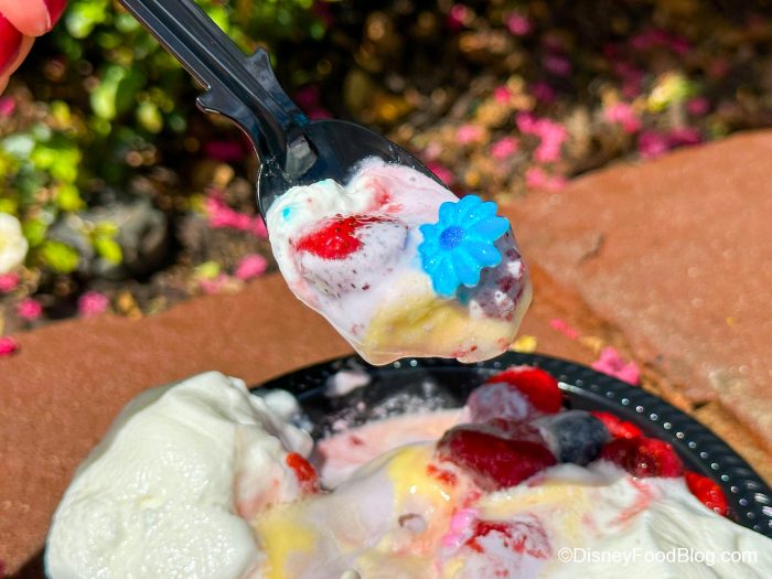Let us tell you what we LOVED about this sundae. The tart lemon Dole Whip just worked SO well with the sweet and creamy berry soft serve. The whipped cream just made it that much more creamy and delicious. We also loved how much fresh fruit was on top — YUM!