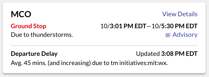 Current storms in the Orlando area have caused many flight delays and cancelations at the Orlando International Airport (MCO). In fact, there is currently a ground stop issued at MCO that lasts through 5:30PM EST.