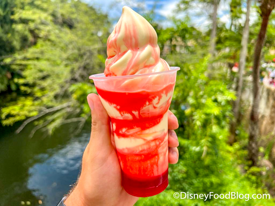This colorful and refreshing treat is yellow and red, just like the beloved lion we know and love. The Pineapple DOLE Whip is the classic kind you can find all over the parks — sweet, creamy, and a little tart. The strawberry syrup added a delicious sweetness, and the pineapple and strawberry flavors went great together!