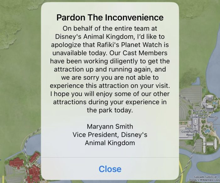 Rafiki’s Planet Watch is closed on July 12th for maintenance on the train tracks. Guests are currently unable to visit the land, and, of course, the activities and attractions within. We got this notification while at Animal Kingdom for the day.