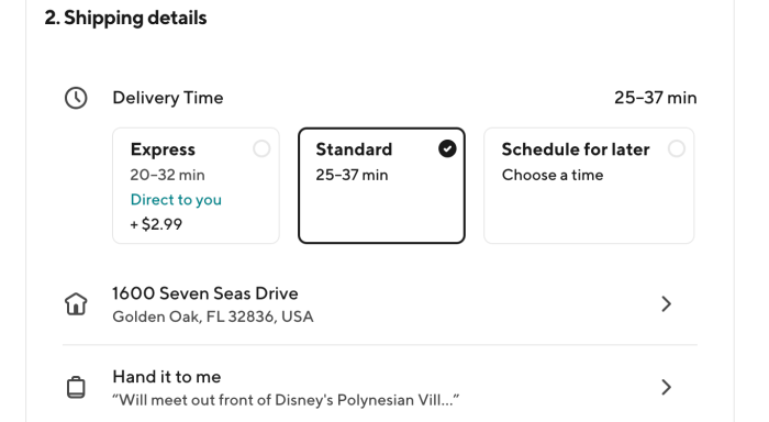 You can select the “Hand it to me” option if you would like. However, this is where you’ll want to leave a message for the drive with any additional information that Cast Members may have provided you earlier. For example, if that hotel takes deliveries at Bell Services, let the driver know. Please note that deliveries to your hotel room directly will not be allowed. TIP: If you ordered sauce or requested silverware, be sure to let your driver know to check for those items.