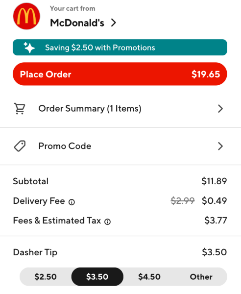 Finally, you will place your order. Here you will be able to add any promo codes you have — be sure to check your emails or DoorDash’s website. You will also see the delivery fee and fees & taxes as well as being able to add a tip for the driver.