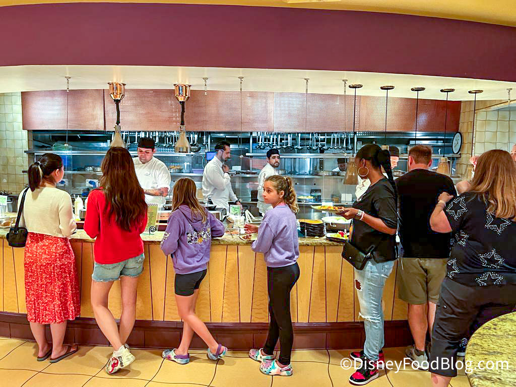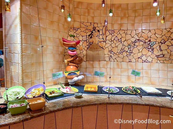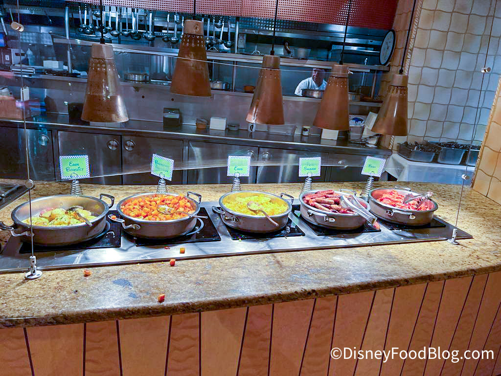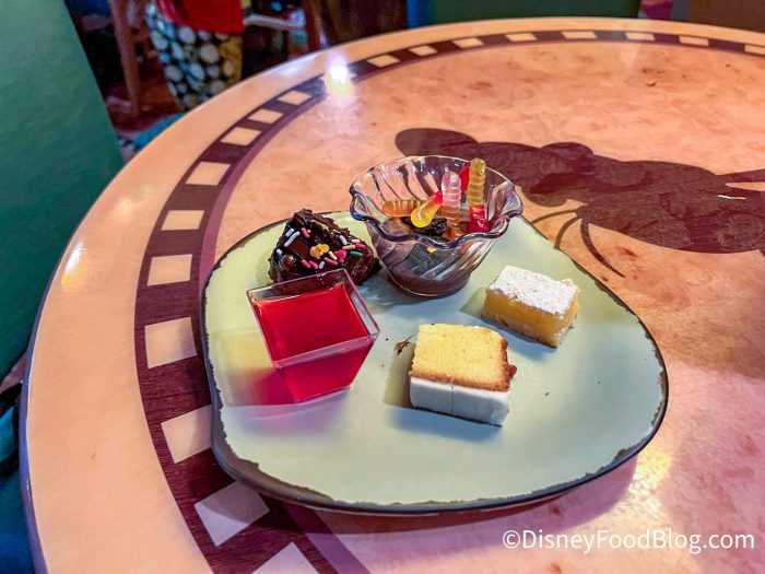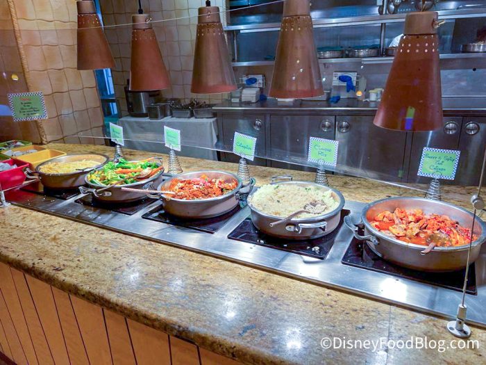 We went right at brunch time, so there was breakfast, lunch, and dessert out! The trick to getting “brunch” at a character meal is to book one of the last times for breakfast. We can’t guarantee it, but you can often get food items from both meals as the buffet transitions!