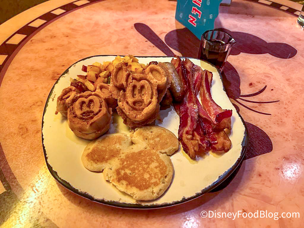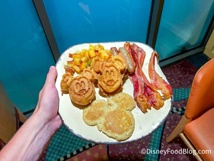So what did we get? Well, for breakfast we grabbed some house potatoes, Mickey waffles, and a Mickey pancake, along with some sausage and bacon.