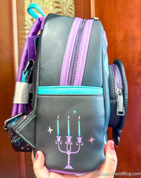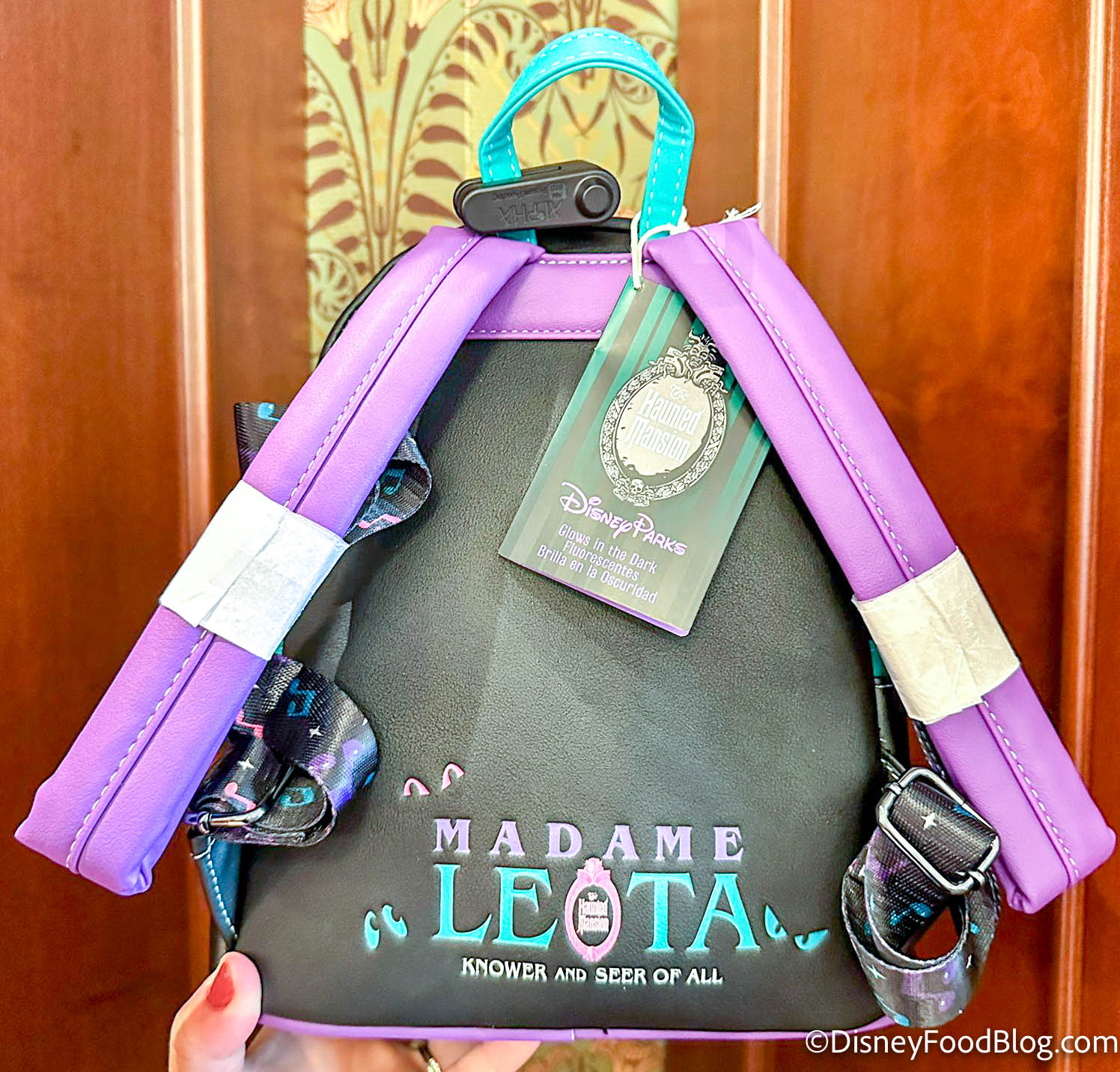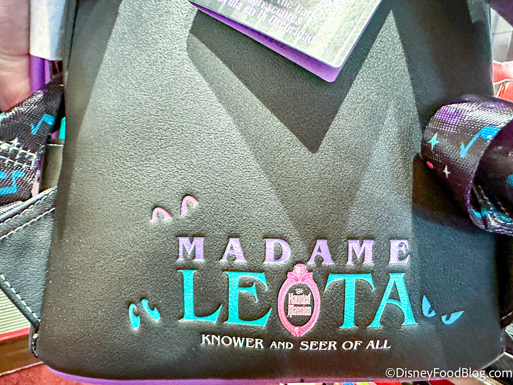 There are purple straps and a Madame Leota detail on the back that says…