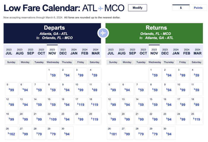 Right now, Southwest Airlines is running a sale on flights from August 10th to December 14th, 2023, and you could grab tickets for as low as $59! Hoping to see Disney World all decked out for the fall? We found one-way tickets from Atlanta to Orlando in November for $59.