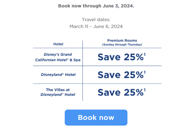The perks continue! Disney Visa Cardmembers can also save up to 25% on premium rooms at a Disneyland Resort hotel. Be sure to use the Disney Visa Card when booking. The deal is available on select rooms Sunday through Thursday nights from March 11th through June 6th, 2024 (book now through June 3rd, 2024).