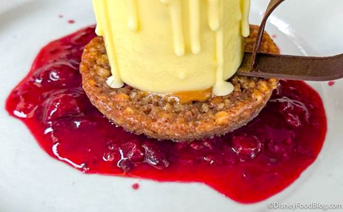 This treat is a white chocolate shell filled with vanilla mousse, standing on top of a pecan cookie with a cherry compote sauce. The sauce is splattered onto the plate for a macabre look, which fits the Haunted Mansion vibes very well.