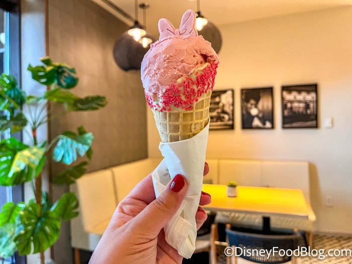 For dessert, you’ll want to head next door to the ice cream shop, Lickety Split. There, you can get the Waddle Cone, which is made with strawberry gelato served in a sprinkle-topped waffle cone. It comes with a little bow on top to imitate Daisy Duck!