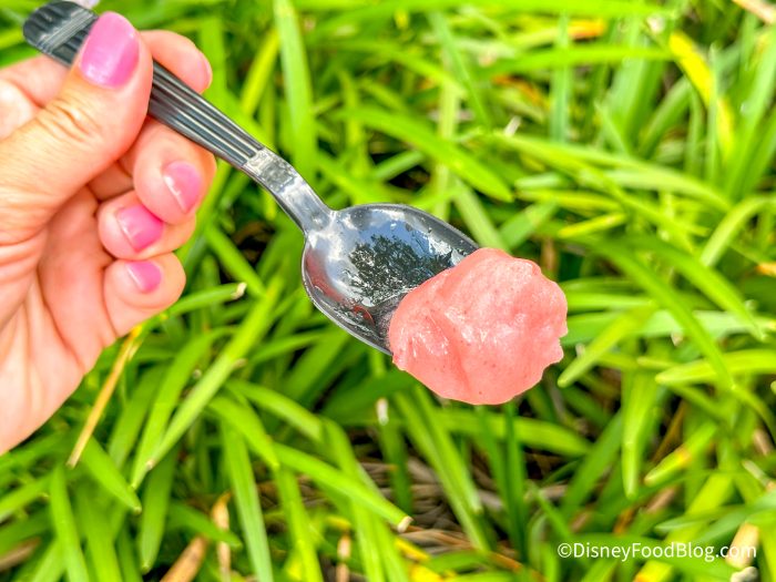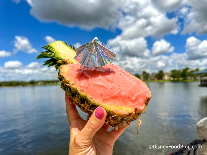 Ok, so it’s a large snack. As in, it’s a half pineapple full of sorbet. The pineapple itself was actually frozen, which helped keep the sorbet cold for a longer period of time in the Florida heat. As Disney snack lovers who constantly battle with fast-melting desserts, we really appreciated that frozen pineapple insulation. However, since the pineapple is frozen, don’t anticipate being able to eat the pineapple itself — unless you’re willing to hack at it.