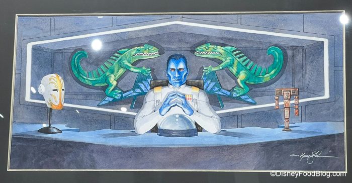OK, so first, we’re going to give you a little background information about the latest souvenir we discovered, so buckle up. It’s an original art piece by Kevin-John Jobczynski, meaning it’s the only one like it in the world. The artwork depicts Grand Admiral Thrawn, a character who might only be known by expert Star Wars fans.
