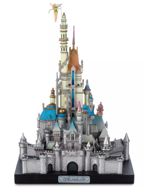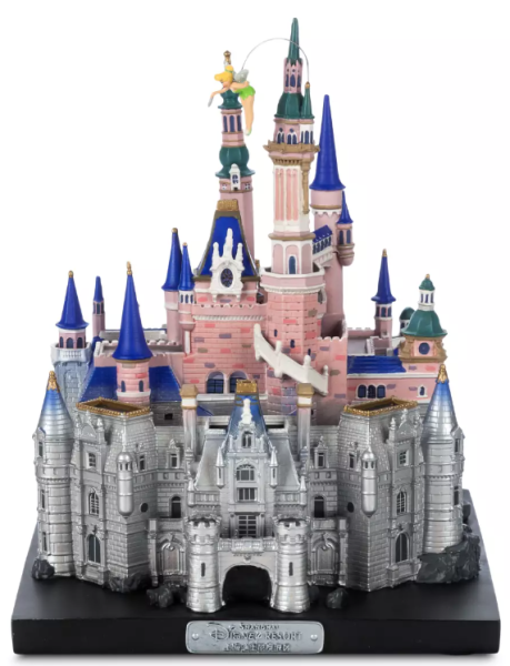 This fully sculpted miniature features the Enchanted Storybook Castle from Shanghai Disneyland. It’s decked out in a “platinum” finish with colorful accents, and adorned with a glittering Tinker Bell figure on wire flying around the top.