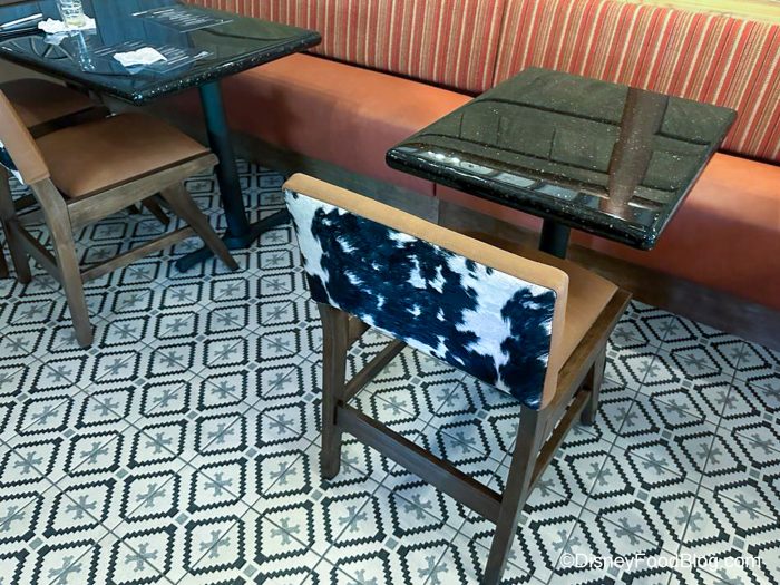You’ll find seating around the bar, as well as barrel tables nearby, in addition to the tables and chairs. Everything looks so nice and shiny!