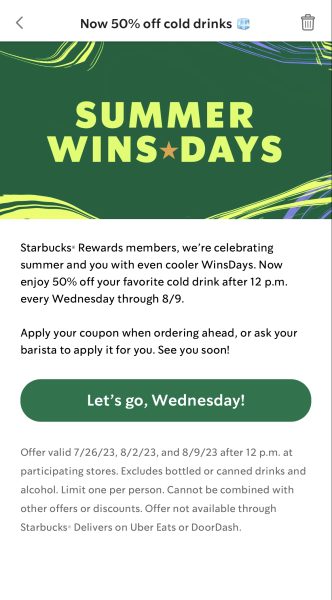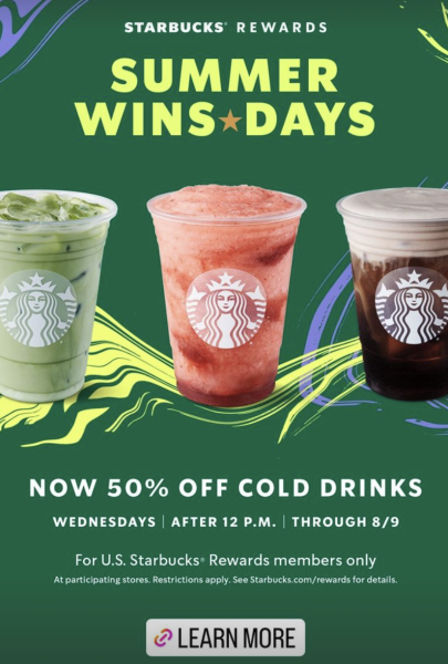 This summer, Starbucks Rewards members can save 50% off of cold drinks after 12PM on select days this summer.