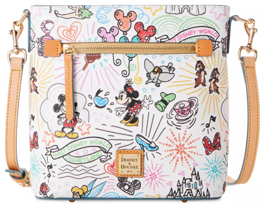 This crossbody bag is covered in a fun Disney Parks icon pattern featuring beloved characters like Mickey Mouse, Minnie Mouse, Tinker Bell, and more.