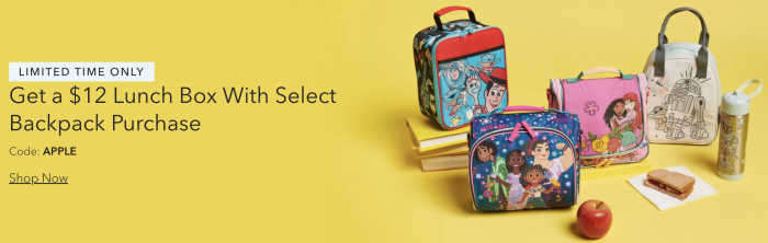 When you buy a select backpack, you can grab this lunchbox for a $7.99 discount, and make sure you type in the code APPLE at checkout in the promo code section.