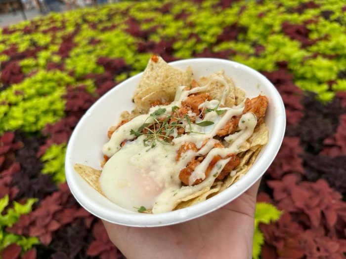 The egg is the tastiest part of this, along with the chicken. The cilantro-lime flavor is zesty when you get a bite of it, but it’s thin. We’ll say that this IS a nice savory and light dish, but if we had a choice when it comes to Mexican food, we’d head to the Mexico Pavilion first before ordering this again.