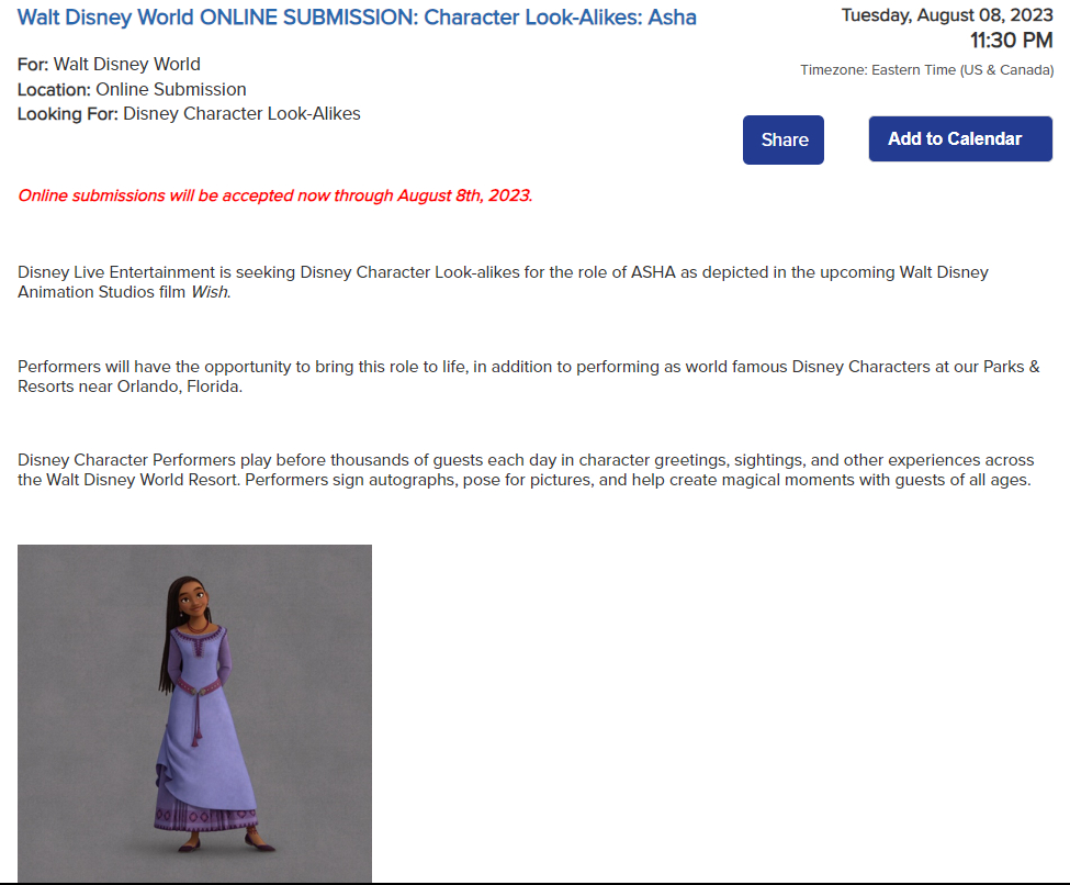 But there’s also a new character coming to Disney World. Disney posted an audition notice in Disney World for Asha, who is the new character starring in the upcoming animated film Wish! The casting call is for Asha look-alikes with “with warm, engaging, and outgoing personalities.”