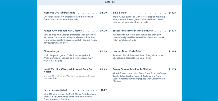 First, Entress includes Memphis Dry-rub Pork Ribs, BBQ Burger, Kansas City Smoked Half-Chicken, and more.