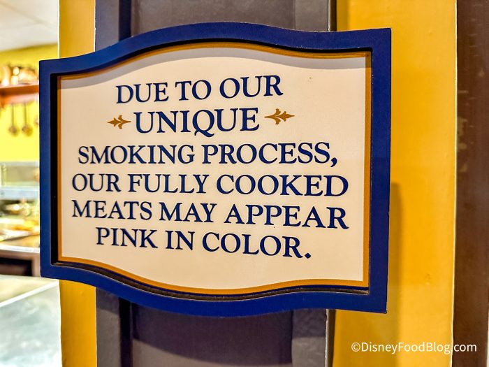 After you order, you’ll see a few signs letting you know that because of their smoking process, even fully cooked meats appear pink in color. This is to give you a heads-up that it is normal for your meat to look like this and to not be alarmed.
