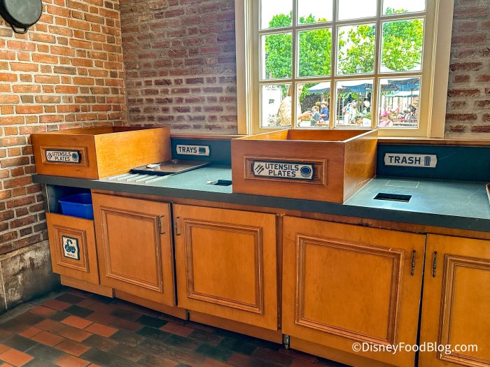 There are trash stations in several locations inside. Be sure to put those plates where they belong and the trays back.