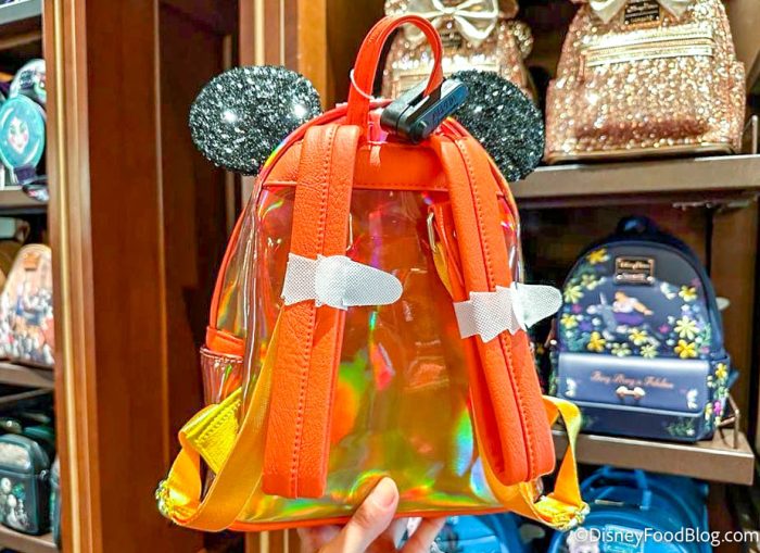 This backpack is glowing with glamor! The iridescent glossy vinyl on the outside has a two-toned orange and yellow appearance. The dramatic contrast with the black sequins on Minnie’s ears, bow, and front pocket, creates a frightfully fashionable bag.