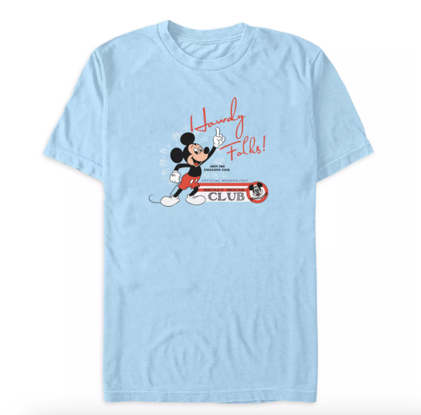 This light blue tee features Mickey Mouse saying, “Howdy Folks!” The Mickey Mouse Club-inspired shirt will make you an official member (see, it even says “official membership”!)