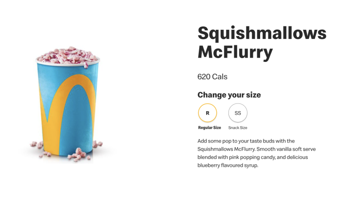 According to the Canada McDonald’s website, a new Squishmallows McFlurry is coming soon to locations in Canada! This is a “smooth vanilla soft serve blended with pink popping candy and delicious blueberry flavored syrup.”