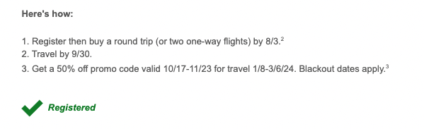Once you join the Rapid Rewards program, you can “register” for the promotion. You’ll simply hit “register” on the promotion website and see a green checkmark indicating that you registered for it. Then, you’ll need to buy either a round trip or 2 one-way flights by August 3rd, 2023 (by 11:59PM CDT). This initial travel needs to be completed by September 30th, 2023.