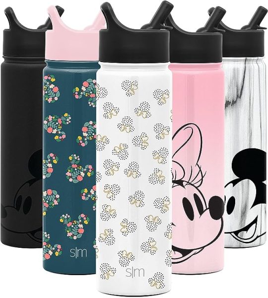 Water bottles like these Disney ones from Simply Modern on Amazon are a good option. They are a twist lid with a closeable straw to prevent any leaks. They are 220z so they can hold a lot of water and their Disney designs are adorable.