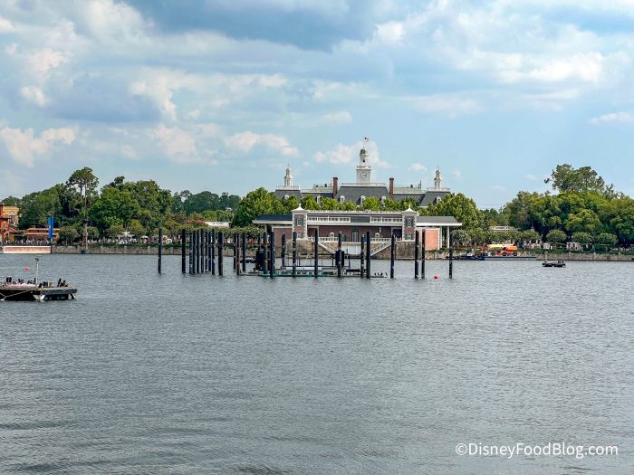 No, we’re not talking about all the construction that’s going on with the massive transformation going on in the park. And we’re not focusing on just when CommuniCore Hall and CommuniCore Plaza will be complete. (It should open by the end of 2023 but no exact date has been announced yet.) Nope, right now the focus is on what’s happening in World Showcase Lagoon, where some mysterious poles have turned up!