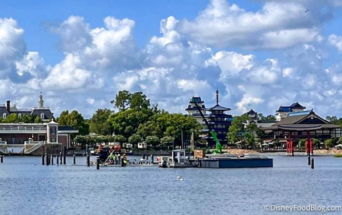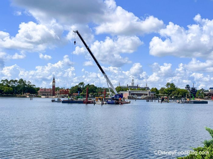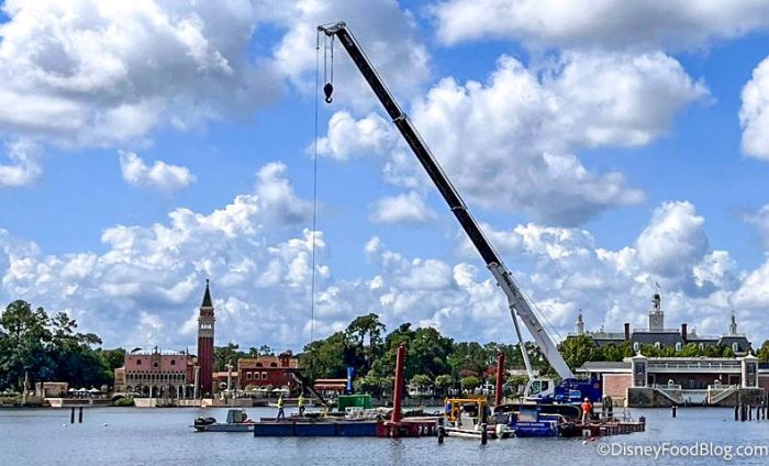 Well, recently, we’ve noticed that some cranes were working on World Showcase Lagoon, and um…well, we don’t know how to tell you this, but it looks like even MORE structures could be added to this body of water.
