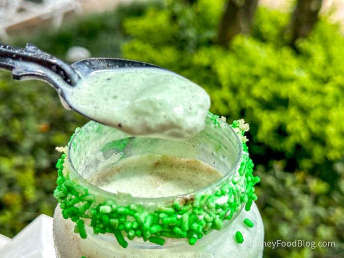 It’s a chocolate chip-mint milkshake with green caramel and a specialty vanilla cupcake for $15. Green caramel? We’re intrigued. It’s kind of giving seaweed vibes, so we’re picking up what Disney was putting down with this one. So, how does it taste?