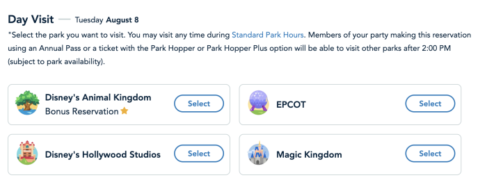 Starting Saturday, August 5th, through Sunday, August 15th, 2023 on most days select parks will allow for these bonus park pass reservations that don’t count against the passholder’s tier allotment. Here’s a breakdown of the dates and parks we saw that were available starting with EPCOT on August 5th, 2023!