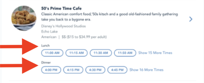 This is a big improvement compared to just having to search for times at “lunch” or “dinner” separately. If this is a feature that Disney fully implements into its updated service (as it appears it will be) this will be a game-changer. Why? Well, if your focus is eating at Sci-Fi Dine-In Restaurant, but you don’t care whether it’s for lunch or dinner, this will make it a LOT easier to find ANY available reservations at that restaurant throughout the day.