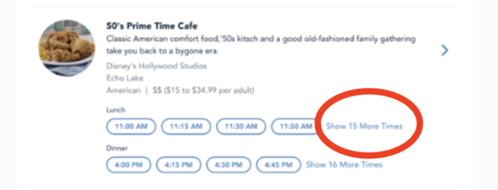 While the system will show you ALL of the available times for the time period and restaurant you’re looking at, the website might not show them all to you at once (likely due to spacing issues). That’s where you’ll see an option that says “Show X More Times.” If you select that, you should be able to get a more complete list of the available reservation times for whatever time period you’re searching.