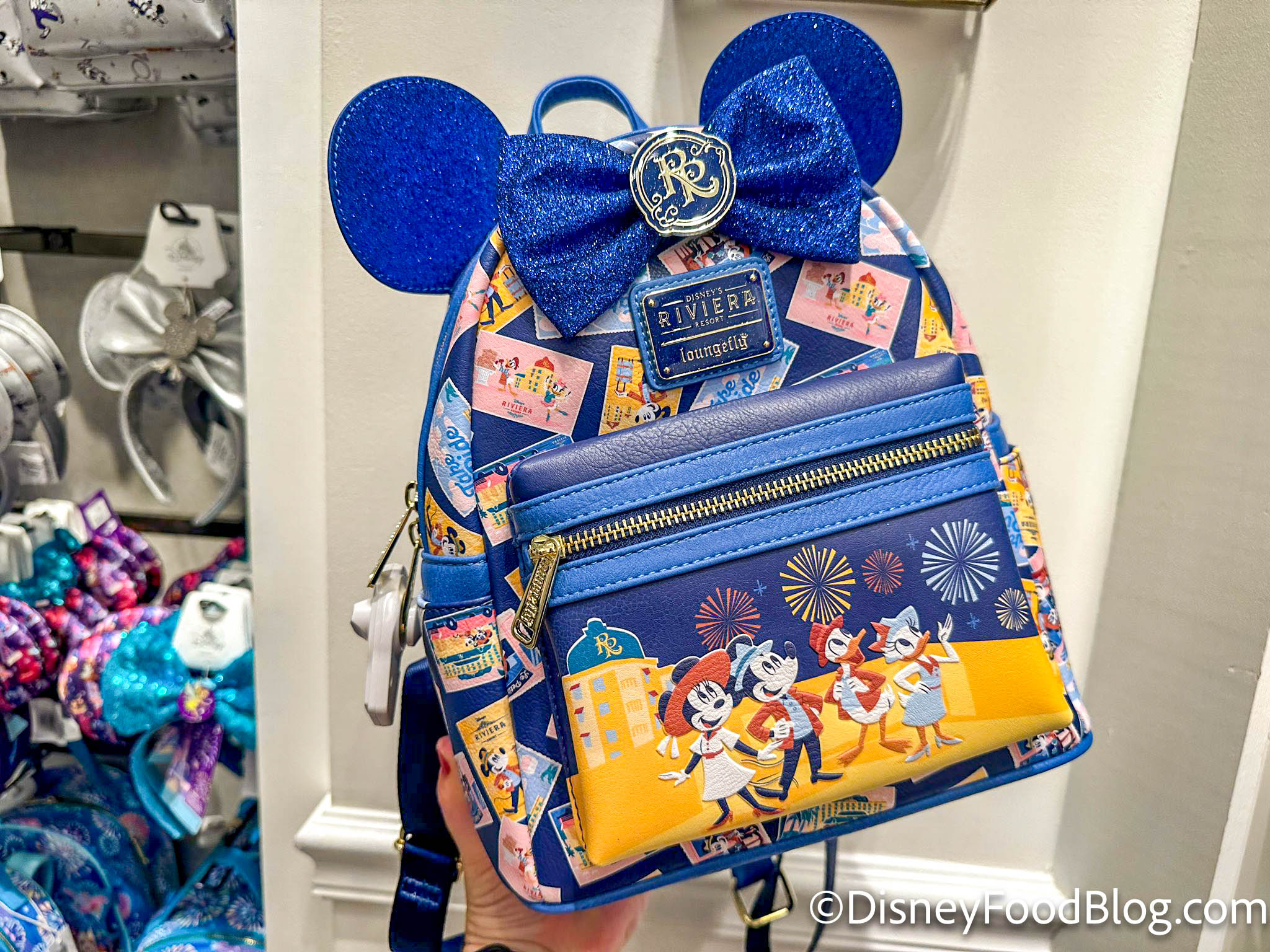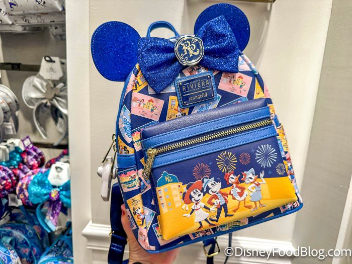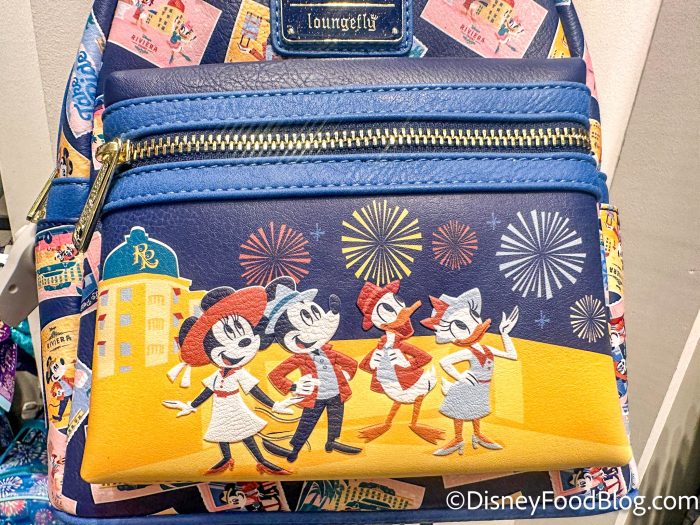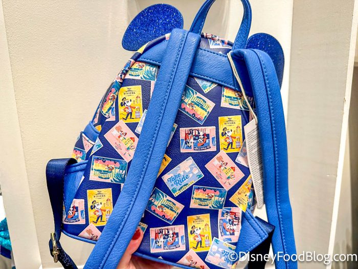 First up, over at Disney’s Riviera Resort, we spotted this Riviera Resort Loungefly Mini Backpack that has blue ears and a postcard design that covers the whole bag.