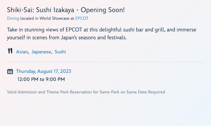 On August 9th, we noticed that the Disney World website had newly listed operating hours for Shiki-Sai: Sushi Izakaya. Check out the calendar — Disney listed operating hours from 12PM to 9PM, but the restaurant still says “Opening Soon!” right above the calendar. How mysterious!